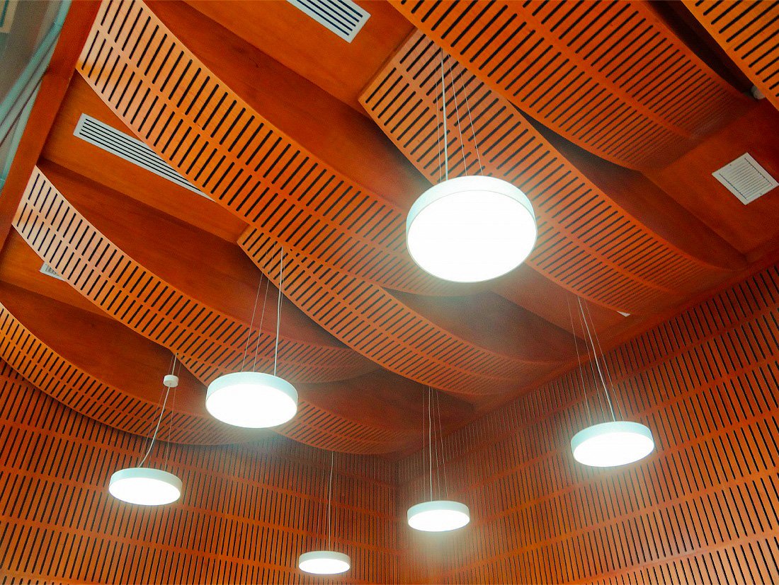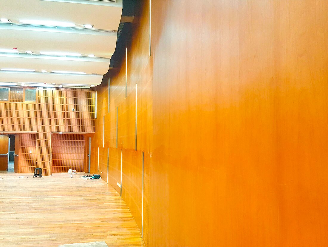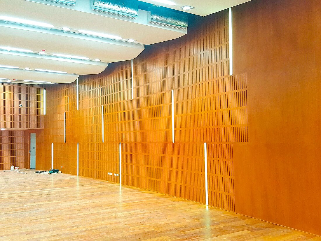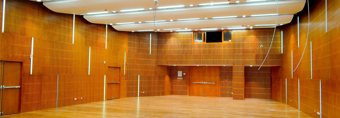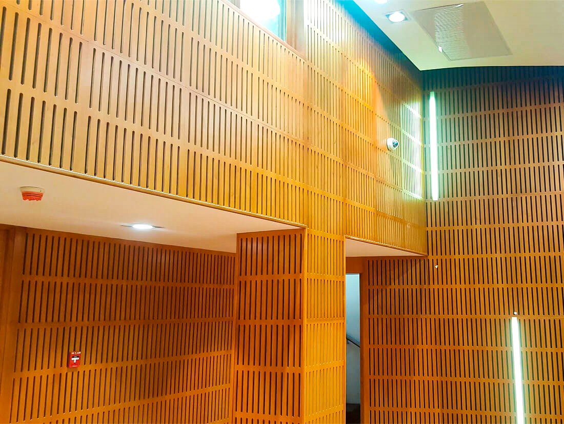 El proyecto cuenta con 1000 m2 de área construida y tiene una capacidad para 180 espectadores. El aislamiento acústico consistió en un solo formato de ranuras en las planchas de madera que varían su tamaño según su ubicación, en las paredes del fondo del auditorio las ranuras son más grandes para generar buena absorción, mientras que en la zona media el tamaño de estas ranuras disminuye, finalmente en la zona del escenario el recubrimiento es totalmente liso sin ningún tipo de ranura con la finalidad de que el sonido rebote y se propague por todo el auditorio.
